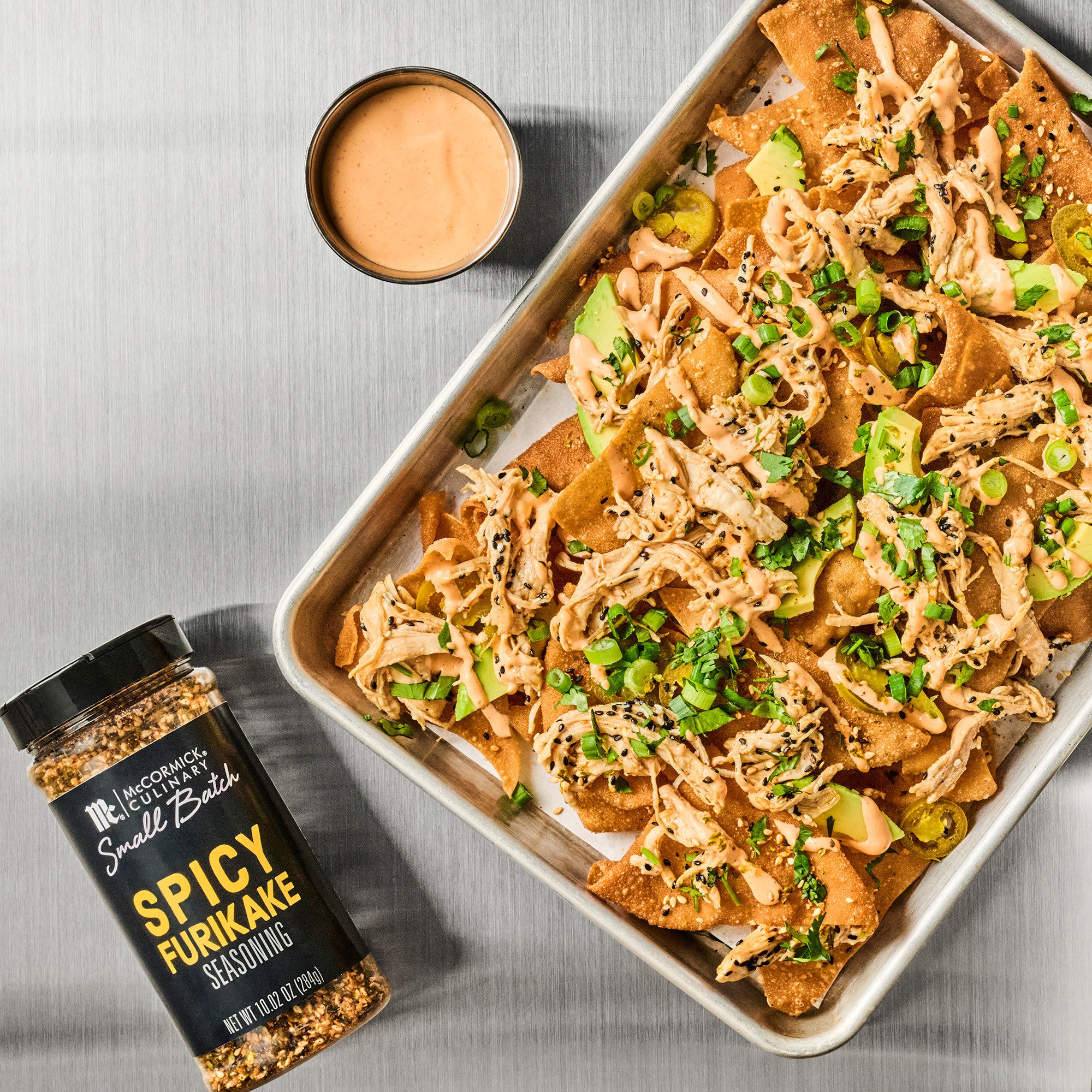 Layered with tender Stingin' Honey Garlic Chicken, creamy avocado slices, and a drizzle of sriracha mayo, it’s the umami-forward flavor profile of McCormick® Spicy Furikake Seasoning that really takes these crispy wonton nachos over the top. A vibrant fusion of flavors and textures, it’s perfect for sharing!