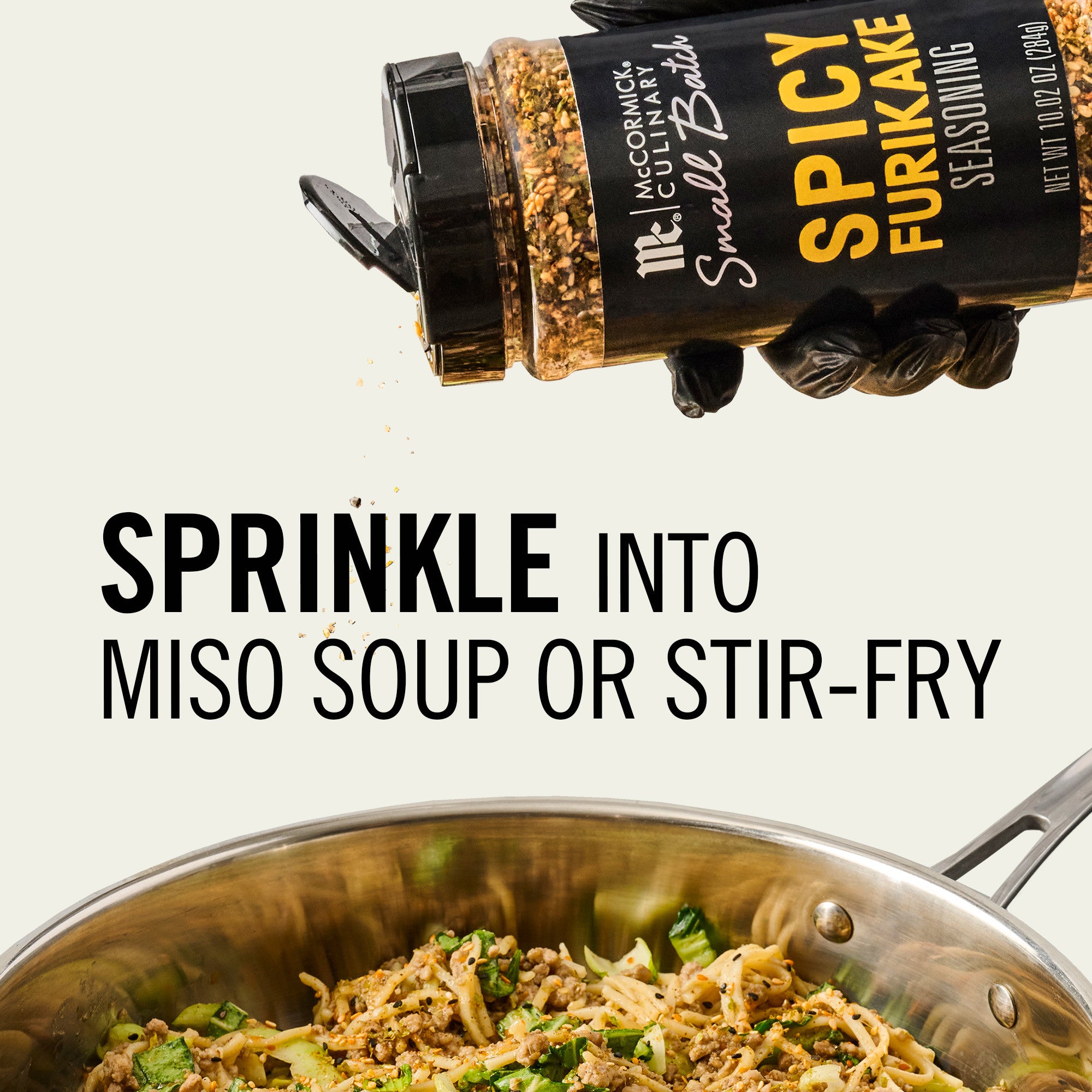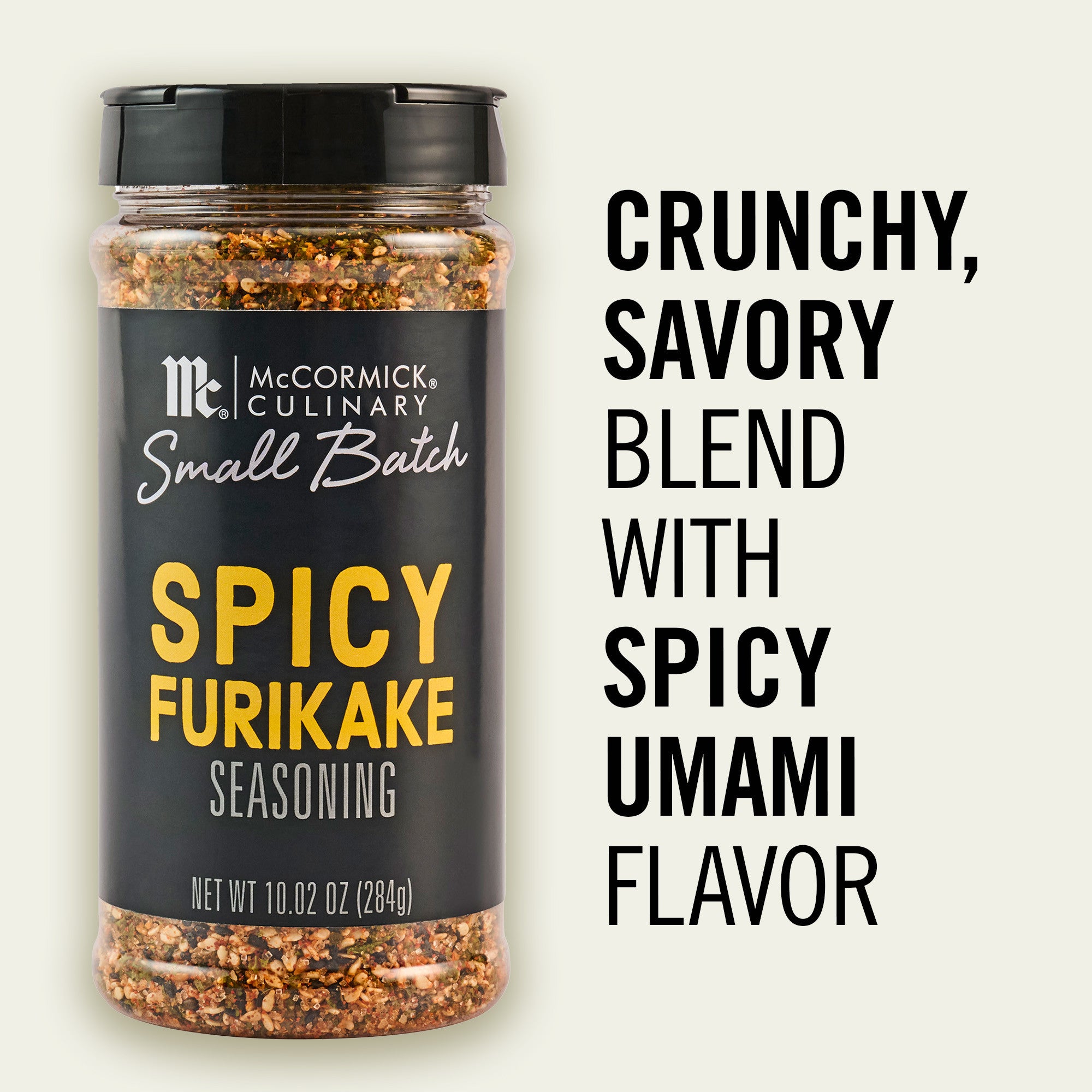 McCormick Culinary Spicy Furikake Seasoning: BLACK AND TOASTED SESAME SEEDS, SALT, SUGAR, RED PEPPER, SEAWEED FLAKES, SUNFLOWER OIL, CITRIC ACID, YEAST EXTRACT, PARSLEY & NATURAL FLAVOR.