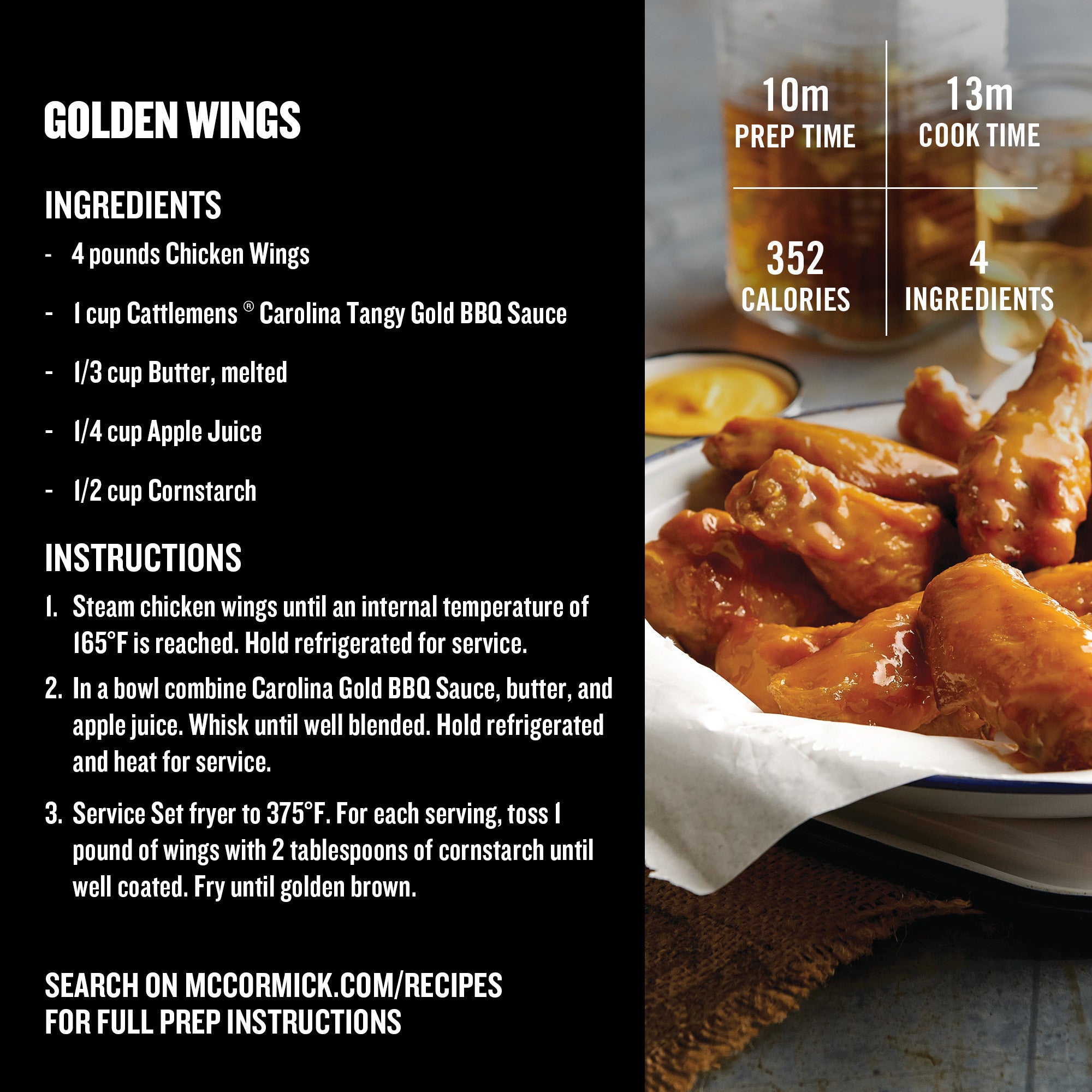 Cattlemen’s Carolina Tangy Gold BBQ Sauce features zesty, creamy mustard, perfectly blended with rich molasses, aged cayenne peppers, apple cider vinegar and natural hickory smoke for unbeatable flavor and distinctive, golden color. For more than 50 years, Cattlemen’s has set the standard for quality and performance with legendary taste and a formula built exclusively for foodservice professionals.