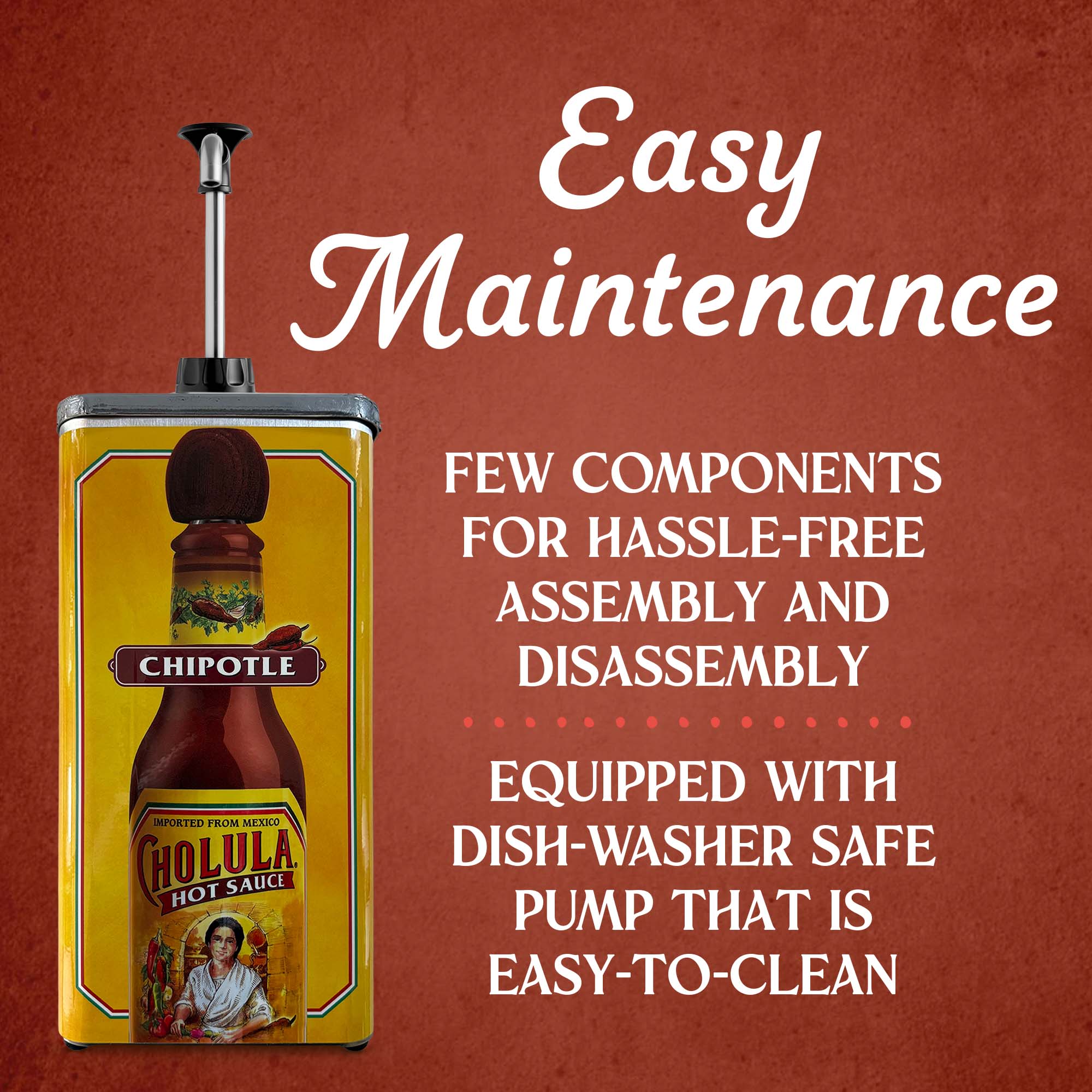 Elevate your foodservice operations with our Cholula dispenser, designed to deliver the vibrant flavor of Cholula Chipotle Hot Sauce with ease and efficiency. This mess-free, ready-to-use dispenser makes it simple to add authentic Mexican hot sauce to recipes or transfer it into smaller containers. Whether you are enhancing signature dishes or offering customers a way to customize their meals, the dispenser ensures precision, cleanliness, and consistency. In today's competitive landscape, operators continue to craft their menus around Mexican cuisine. That is why our dispenser is more than a convenient solution: it is a smart choice to boost efficiency, reduce waste, and elevate the guest experience. Perfect for high-volume settings such as commercial kitchens, restaurants, cafeterias, and food trucks, this is a must-have for operators looking for a condiment solution that serves unmistakable flavor with every pump.
