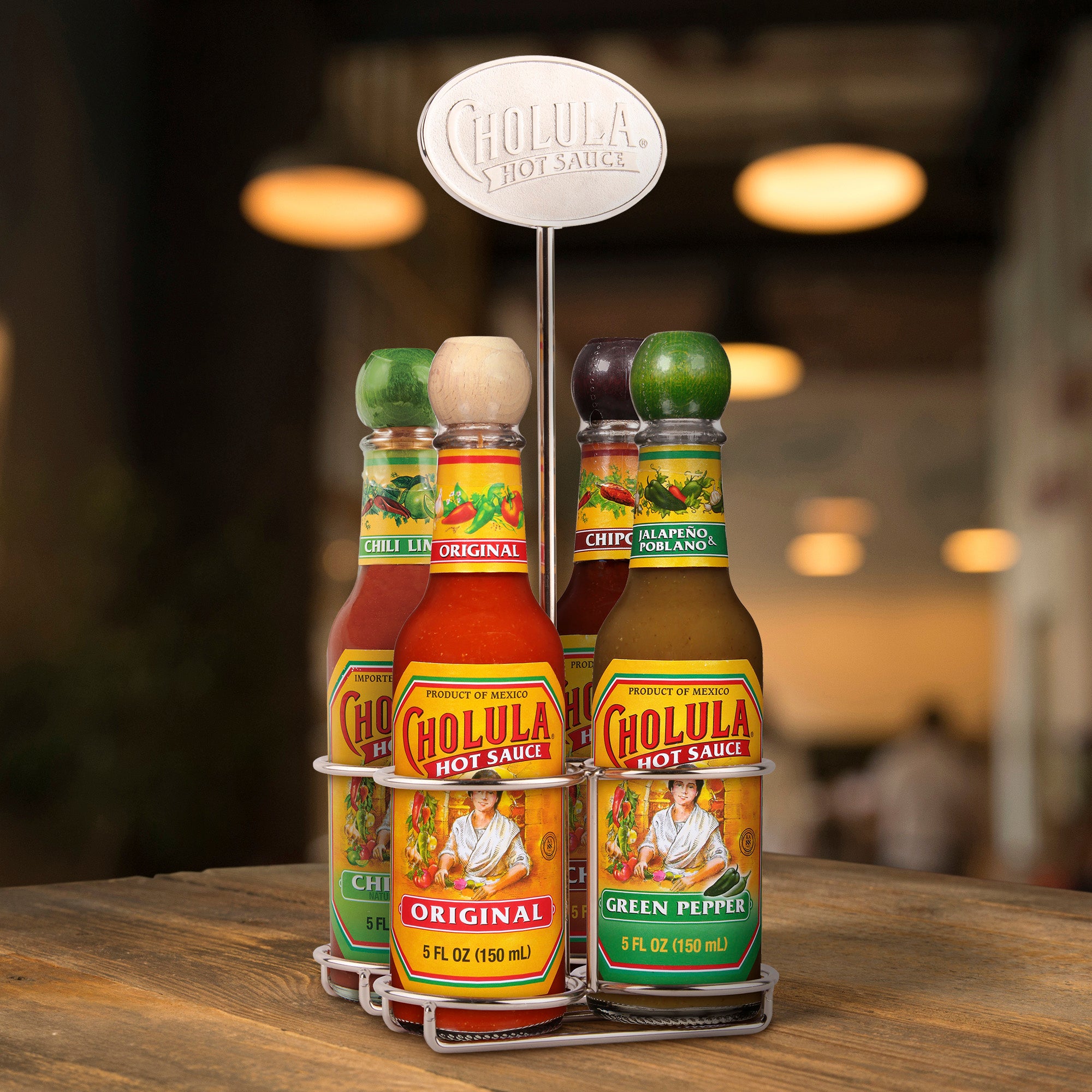 EFFICIENCY & ACCESSIBILITY: Ensure that four signature Cholula bottles are always within arm's reach, no matter how busy it gets, helping staff and guests move through meals with less disruption and more speed