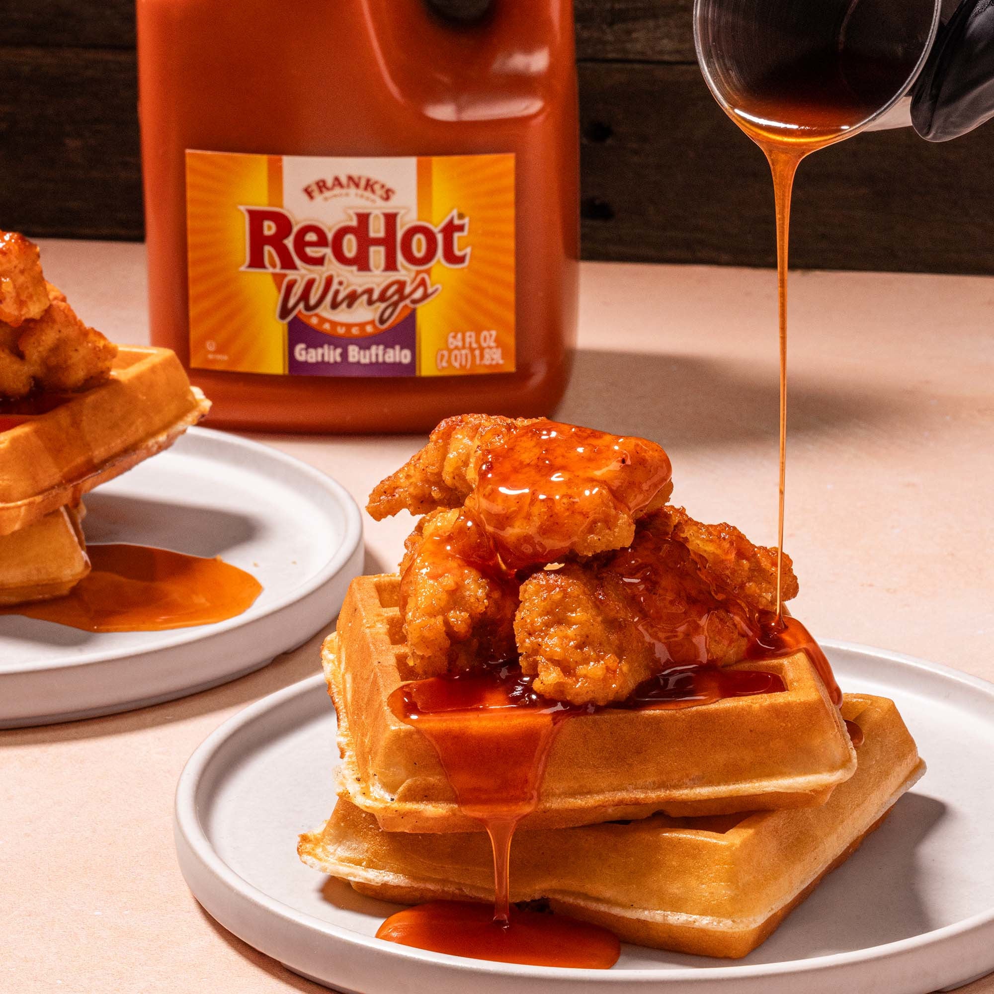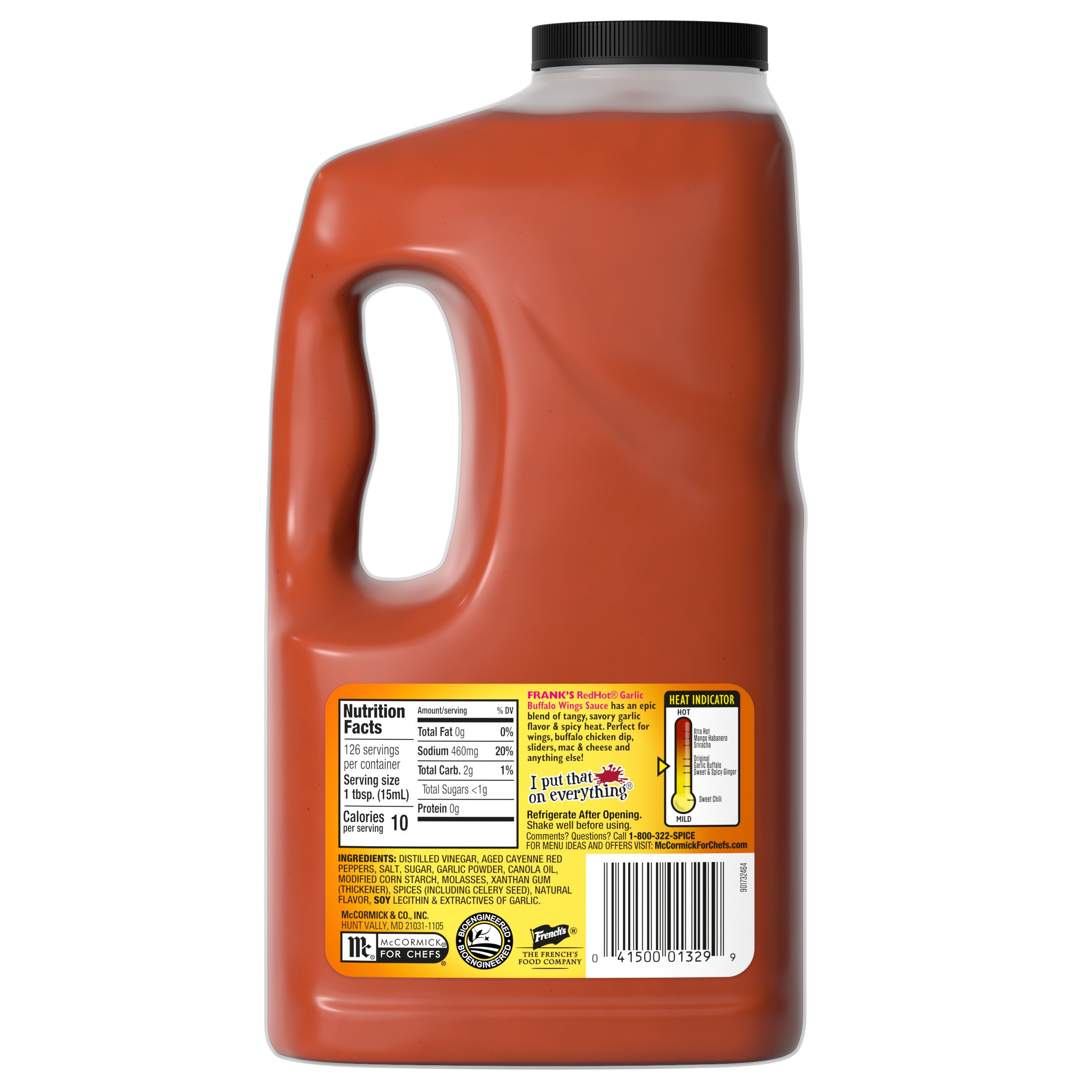 Frank's RedHot Garlic Buffalo Wings Sauce is an epic blend of tangy, savory garlic flavor and spicy heat. It brings the authentic buffalo flavor your guests crave, with a twist, that will have them coming back for more. Our 1/2-gallon jug is ideal for professional use - it’s ready to use right out of the bottle to spice up classic menu items or create new recipes that pack some heat. For over 50 years, Frank's RedHot has been delivering The Perfect Blend of Flavor and Heat® that patrons expect.