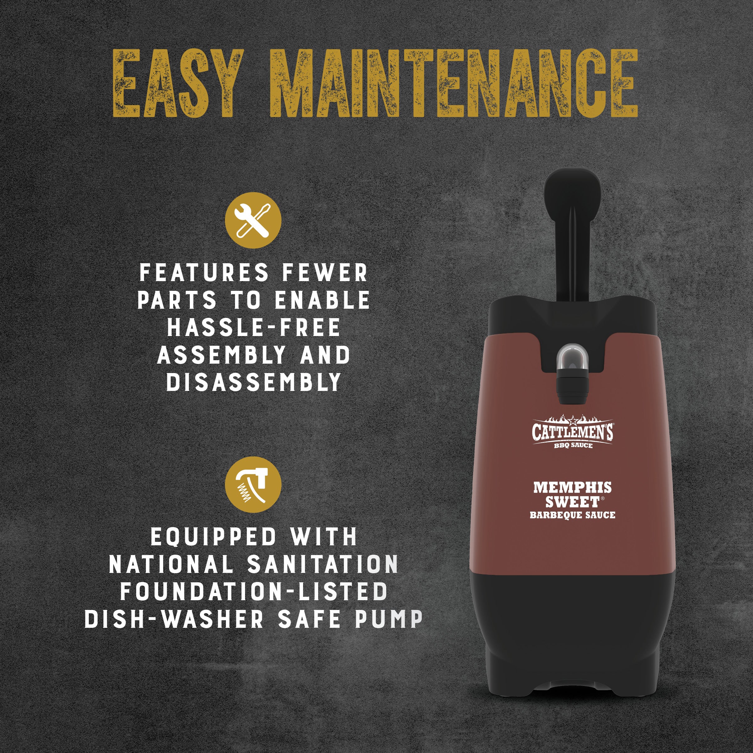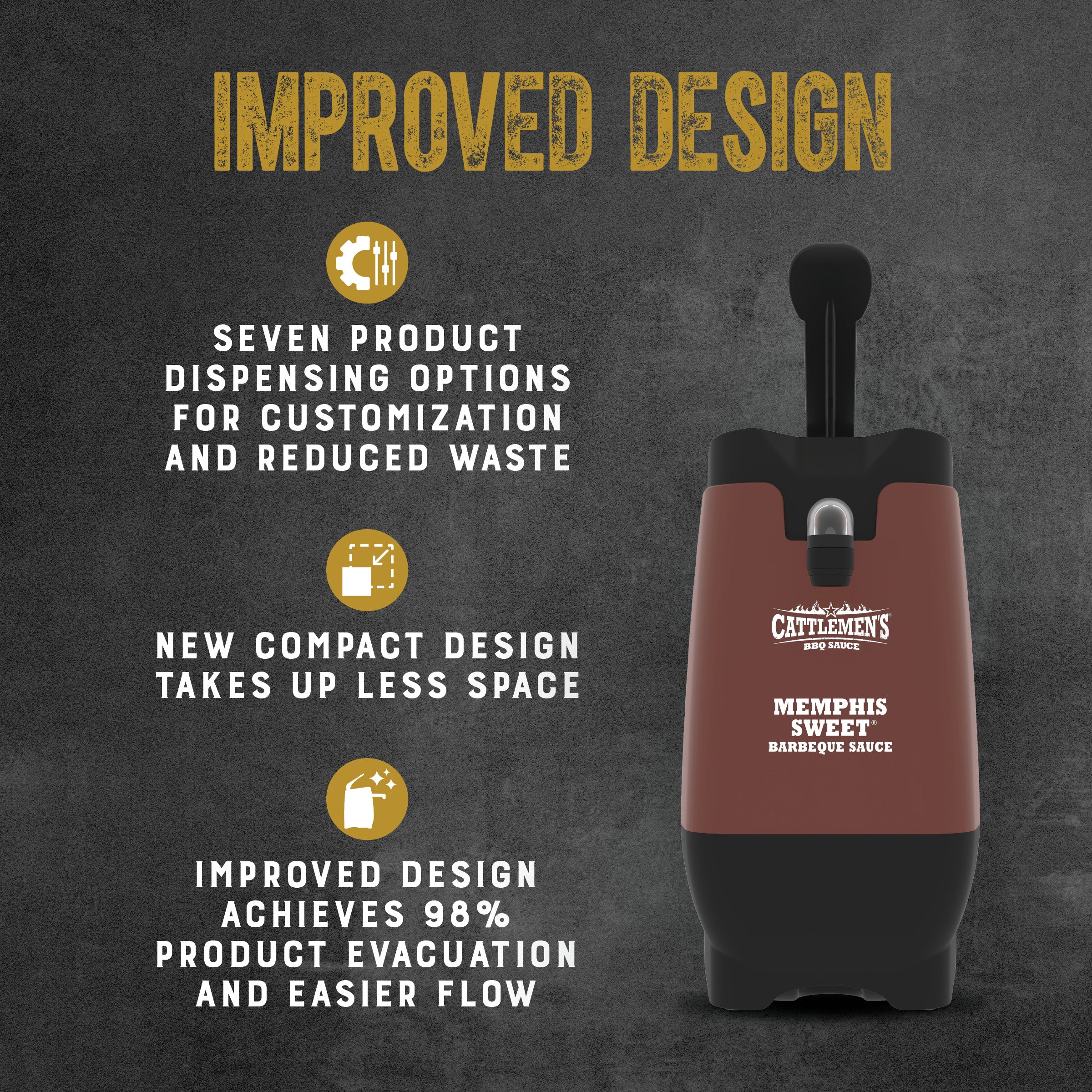 Elevate your foodservice operations with our improved condiment dispenser, designed to deliver the legendary flavor of Cattlemen's Memphis Sweet Barbeque Sauce with ease and efficiency. This mess-free, ready-to-use dispenser makes it simple to add a trusted condiment to recipes or transfer it into smaller containers. Whether you are enhancing signature dishes or offering customers a way to customize their meals, the dispenser ensures precision, cleanliness, and consistency. In today's competitive dining landscape, patrons value variety and familiar brands. That is why our dispenser is more than a convenient solution: it is a smart choice for operators to boost efficiency, reduce waste, and elevate the guest experience. Perfect for high-volume settings such as commercial kitchens, restaurants, cafeterias, and food trucks, this is a must-have for operators looking for a condiment solution that serves unmistakable flavor with every pump.