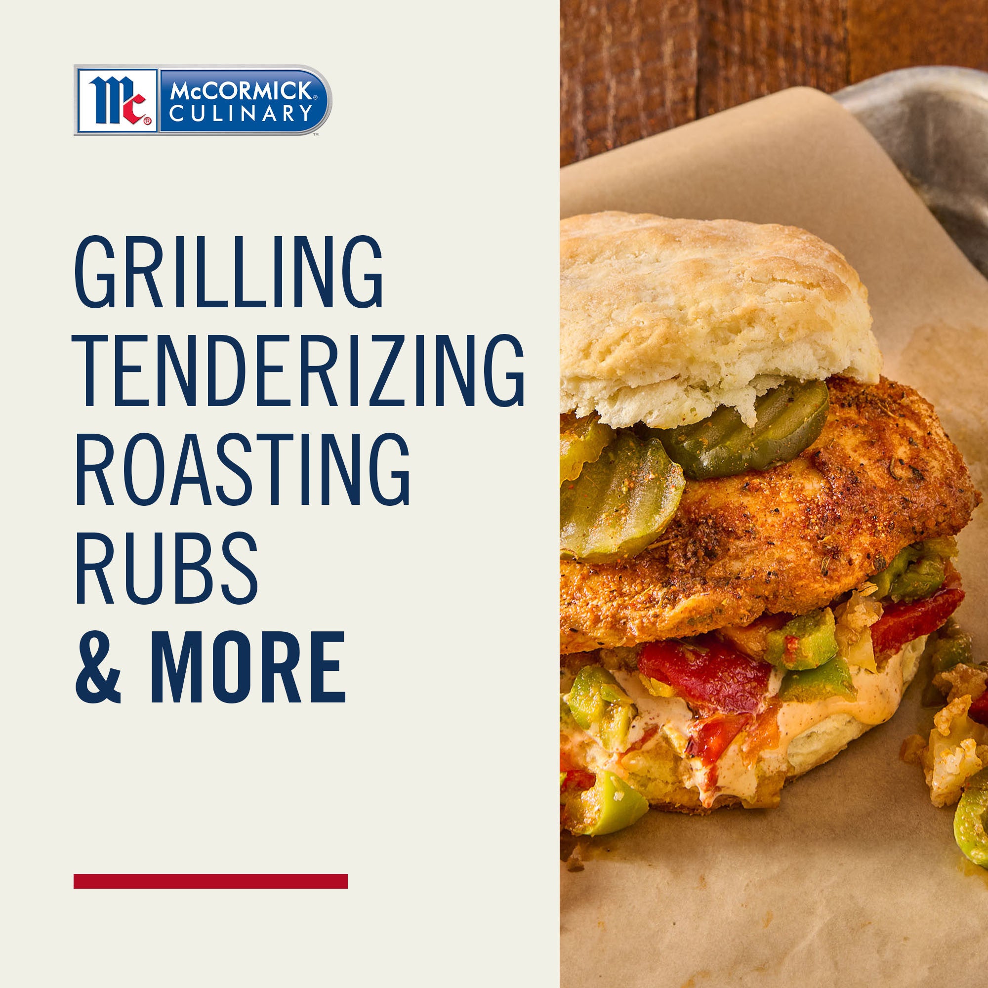 Elevate any sandwich menu with this unique Cajun twist on chicken and biscuits. Juicy blackened chicken breast flavored with McCormick Culinary Blackened Seasoning is the star of the show, with a smoky blackened aioli, muffuletta-inspired olive spread and tangy Cajun quick pickles.