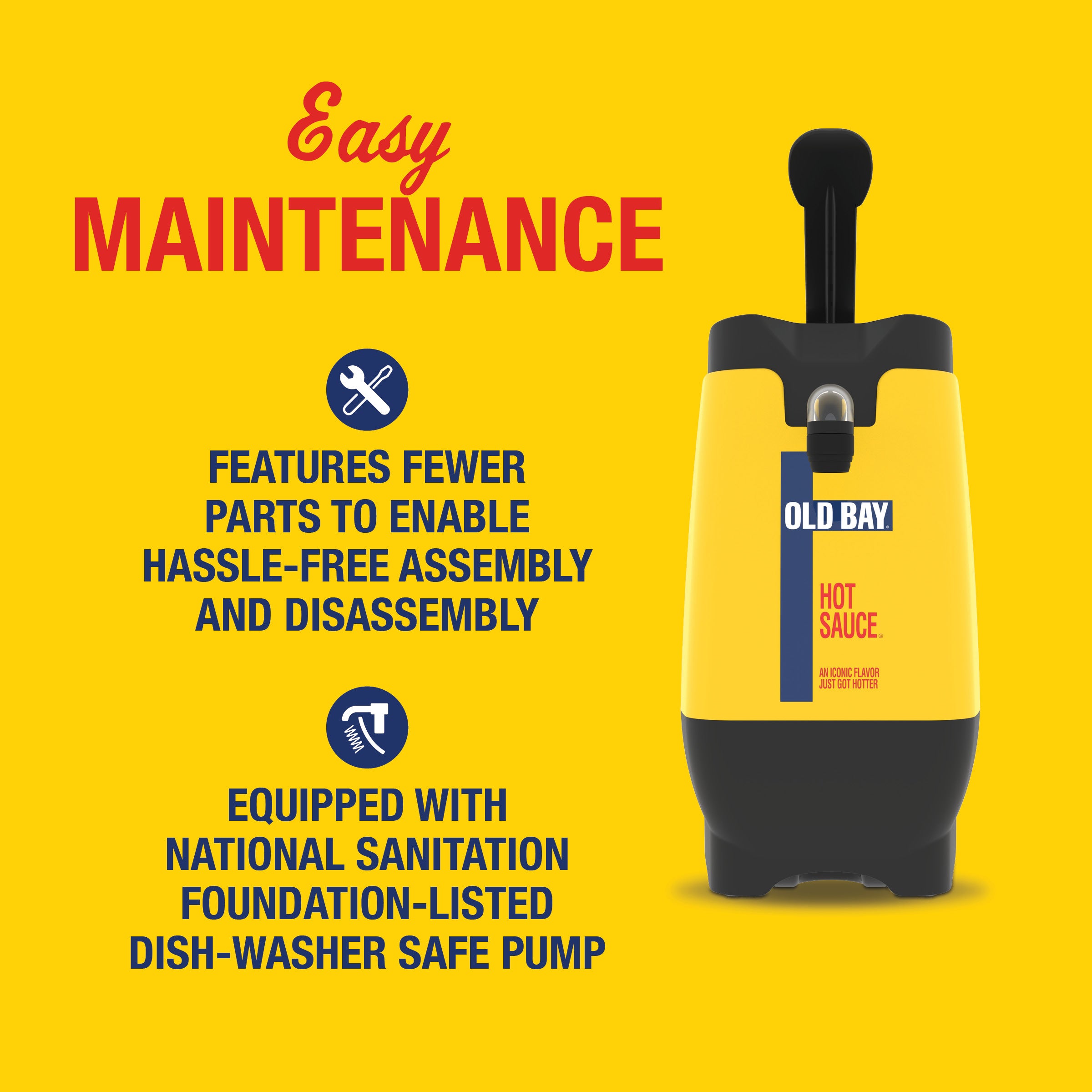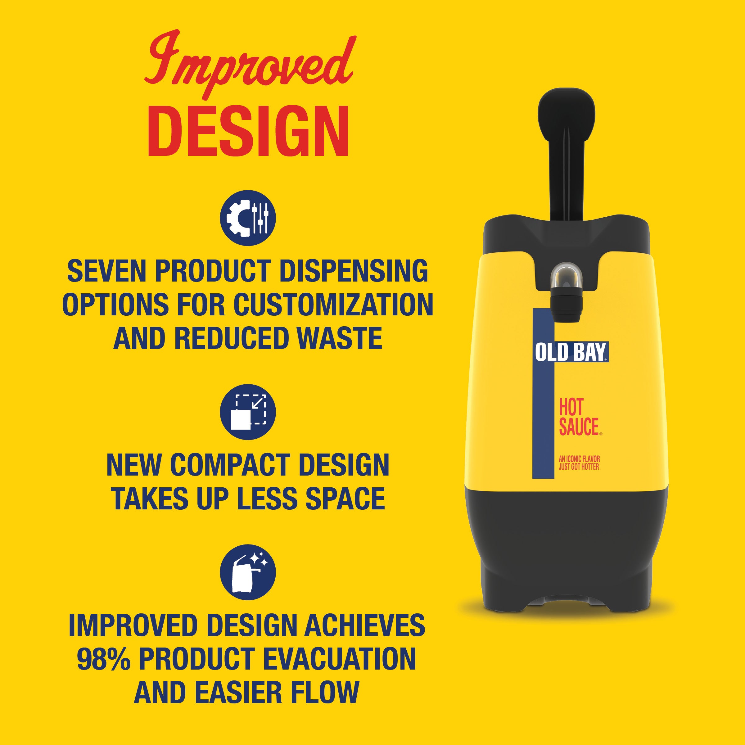 Elevate your foodservice operations with our improved condiment dispenser, designed to deliver the iconic flavor of OLD BAY Hot Sauce with ease and efficiency. This mess-free, ready-to-use dispenser makes it simple to add a trusted condiment to recipes or transfer it into smaller containers. Whether you are enhancing signature dishes or offering customers a way to customize their meals, the dispenser ensures precision, cleanliness, and consistency. In today's competitive dining landscape, patrons value variety and familiar brands. That is why our dispenser is more than a convenient solution: it is a smart choice for operators to boost efficiency, reduce waste, and elevate the guest experience. Perfect for high-volume settings such as commercial kitchens, restaurants, cafeterias, and food trucks, this is a must-have for operators looking for a condiment solution that serves unmistakable flavor with every pump.